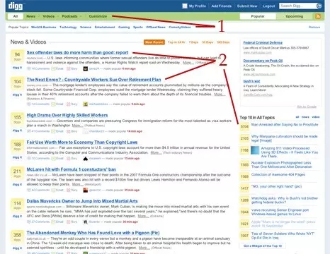 Digg首先在header部分展示出的是一个水平的导航栏,然后跳到主要内容的展示部分,每篇文章依次列开。这就给读者一种连续的感觉,会顺着往下滑。而这个小技巧也被用在了右侧的Top 10文章排列中。