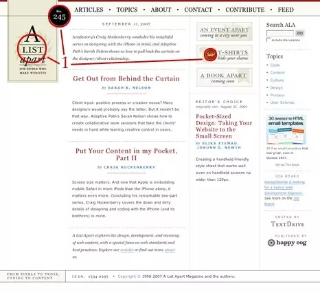正如你在图4a中所见,A List Apart用了不止一个,而是多组"圆形"来突显出其Logo。你不仅能通过其旁边那个有着发行编码的标志(1)注意到它,也能通过右手边几个更小的标志注意到T恤促销的信息。