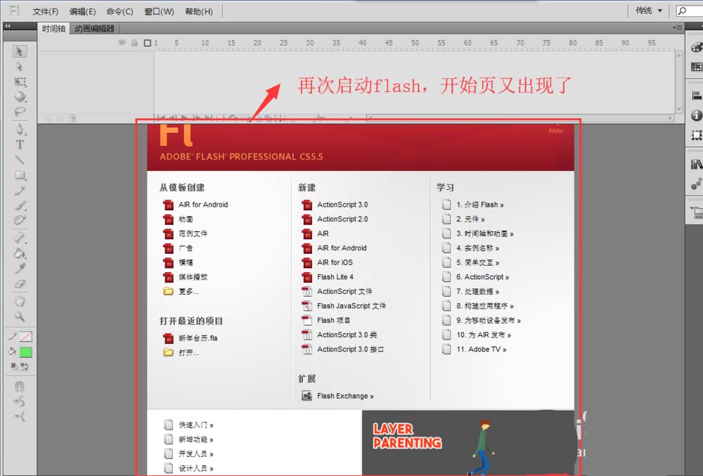 6、当首选参数窗口关闭之后我们就看到开始页就出现了。包括我们之后再次启动flash软件都能够再次看到开始页。